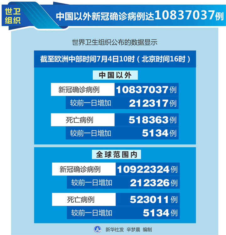 世衛(wèi)組織每日疫情報告顯示,截至歐洲中部時間4日10時(北京時間16時),中國以外新冠確診病例較前一日增加212317例,達(dá)到10837037例;中國以外死亡病例較前一日增加5134例,達(dá)到518363例。