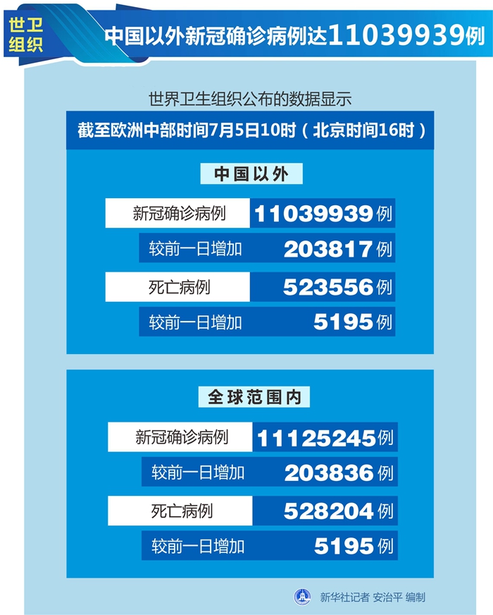 世衛(wèi)組織每日疫情報告顯示,截至歐洲中部時間5日10時(北京時間16時),中國以外新冠確診病例較前一日增加203817例,達(dá)到11039939例;中國以外死亡病例較前一日增加5195例,達(dá)到523556例。
