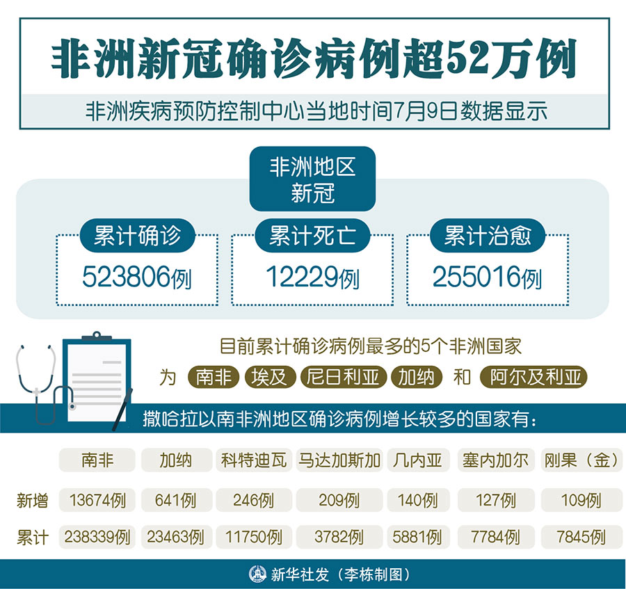 新華社雅溫得7月9日電 綜合新華社駐非洲地區(qū)記者報道:非洲疾病預防控制中心9日數(shù)據(jù)顯示,非洲地區(qū)新冠累計確診病例已達523806例,累計死亡12229例,累計治愈255016例。