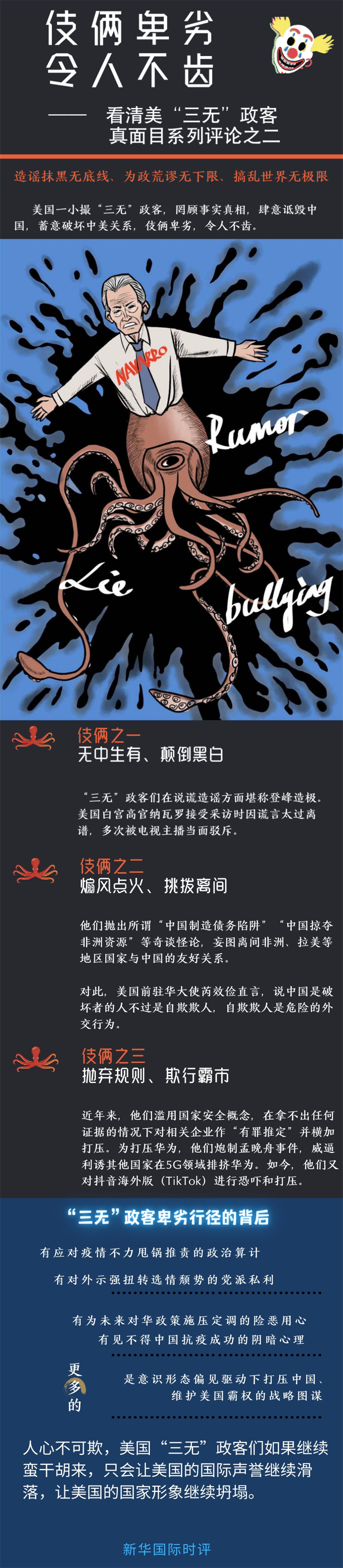 回憶在中央情報(bào)局的任職經(jīng)歷時(shí),美國(guó)國(guó)務(wù)卿蓬佩奧難得說(shuō)了句實(shí)話:“我們?nèi)鲋e、我們欺騙、我們偷竊……這才是美國(guó)不斷探索進(jìn)取的榮耀?!痹谶@種畸形價(jià)值觀的驅(qū)動(dòng)下,美國(guó)一小撮造謠抹黑無(wú)底線、為政荒謬無(wú)下限、搞亂世界無(wú)極限的“三無(wú)”政客罔顧事實(shí)真相,肆意詆毀中國(guó),蓄意破壞中美關(guān)系,伎倆卑劣,令人不齒。