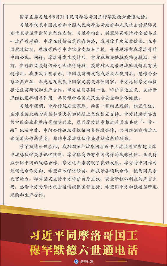 習(xí)近平代表中國政府和中國人民向摩洛哥政府和人民抗擊新冠肺炎疫情表示誠摯慰問和堅定支持。習(xí)近平指出,新冠肺炎疫情對全世界是一次嚴(yán)峻考驗。中摩在疫情面前同舟共濟,我同你多次互致信函。在中國抗疫初期,摩洛哥給予中方寶貴支持和聲援,并關(guān)照滯留在摩洛哥的中國公民。同樣,摩洛哥發(fā)生疫情后,中方積極提供抗疫物資援助。當(dāng)前,新冠肺炎疫情仍處于大流行階段,疫苗對人類最終戰(zhàn)勝疫情具有關(guān)鍵作用。我多次明確表示,中國疫苗研發(fā)完成并投入使用后,愿作為全球公共產(chǎn)品,率先惠及發(fā)展中國家尤其是非洲國家。中方愿同摩方積極推進(jìn)疫苗研發(fā)和生產(chǎn)合作。雙方應(yīng)同各國一道,維護多邊主義,支持世衛(wèi)組織發(fā)揮領(lǐng)導(dǎo)作用,共同維護各國人民生命安全和身體健康。