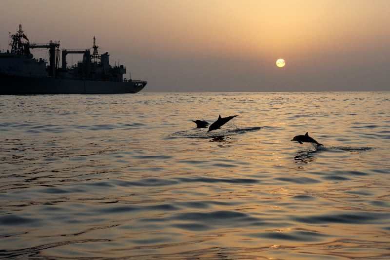 中國(guó)海軍赴亞丁灣索馬里海域護(hù)航編隊(duì)始終秉持海洋命運(yùn)共同體理念,堅(jiān)持人與大海和諧相處,注重生態(tài)環(huán)境保護(hù),贏得大自然積極回報(bào),經(jīng)常出現(xiàn)編隊(duì)艦艇航行時(shí)有成群海豚伴航、待機(jī)集結(jié)時(shí)有各類魚群相伴的和諧場(chǎng)景。