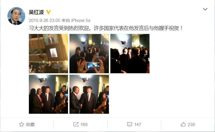 時任聯(lián)合國副秘書長吳紅波說,習(xí)主席走下講臺時,二三十位其他國家領(lǐng)導(dǎo)人排隊與他握手表示祝賀,走廊里擠得滿滿當(dāng)當(dāng)。