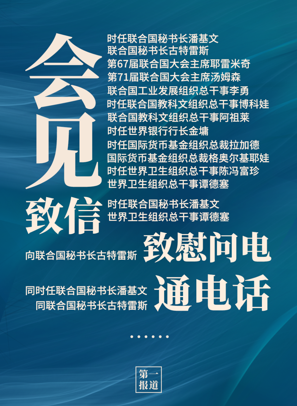 2013年以來(lái),習(xí)主席通過(guò)會(huì)見(jiàn)、通話、致信函等多種方式同聯(lián)合國(guó)主要官員保持密切溝通。互動(dòng)對(duì)象包括聯(lián)合國(guó)秘書(shū)長(zhǎng)、聯(lián)合國(guó)大會(huì)主席,還有聯(lián)合國(guó)工業(yè)發(fā)展組織、聯(lián)合國(guó)教科文組織、世界銀行、國(guó)際貨幣基金組織、世界衛(wèi)生組織等聯(lián)合國(guó)專(zhuān)門(mén)機(jī)構(gòu)主要負(fù)責(zé)人。