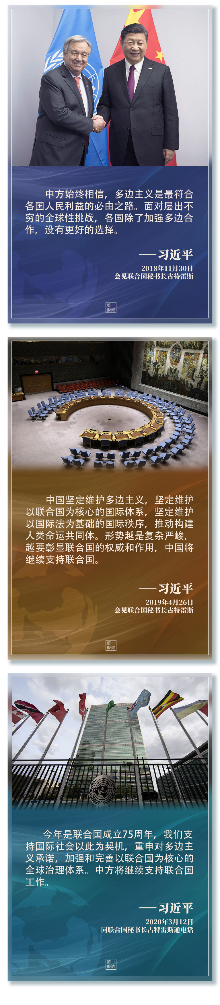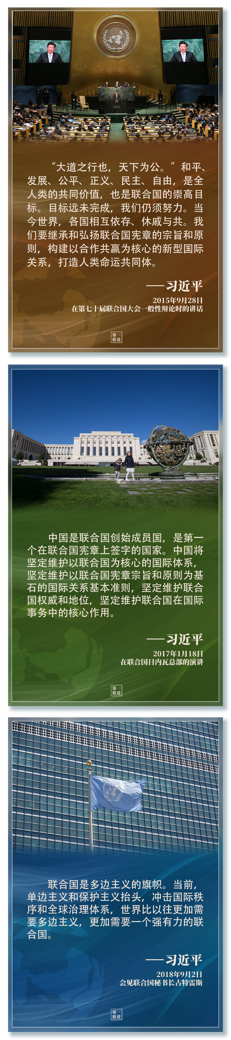 習(xí)主席指出,“支持聯(lián)合國(guó)發(fā)揮作用,維護(hù)聯(lián)合國(guó)權(quán)威和地位,是中國(guó)外交一項(xiàng)基本政策?!?/strong>2013年以來(lái),習(xí)主席多次會(huì)見(jiàn)聯(lián)合國(guó)主要官員,訪問(wèn)聯(lián)合國(guó)總部及聯(lián)合國(guó)專(zhuān)門(mén)機(jī)構(gòu),出席一系列聯(lián)合國(guó)活動(dòng)……親自推動(dòng)中國(guó)同聯(lián)合國(guó)的合作,發(fā)出支持聯(lián)合國(guó)事業(yè)、捍衛(wèi)多邊主義的中國(guó)強(qiáng)音。