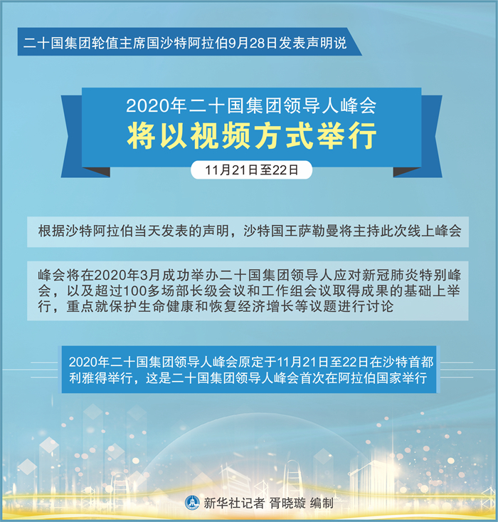根據(jù)沙特阿拉伯當天發(fā)表的聲明,沙特國王薩勒曼將主持此次線上峰會。峰會將在今年3月成功舉辦二十國集團領(lǐng)導人應(yīng)對新冠肺炎特別峰會,以及超過100多場部長級會議和工作組會議取得成果的基礎(chǔ)上舉行,重點就保護生命健康和恢復經(jīng)濟增長等議題進行討論。