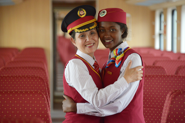 2016年10月1日,在埃塞俄比亞首都亞的斯亞貝巴拉布車(chē)站,中方列車(chē)長(zhǎng)丁繼華(左)和埃塞俄比亞乘務(wù)員沃克內(nèi)什·貝特魯擁抱。新華社記者孫瑞博攝