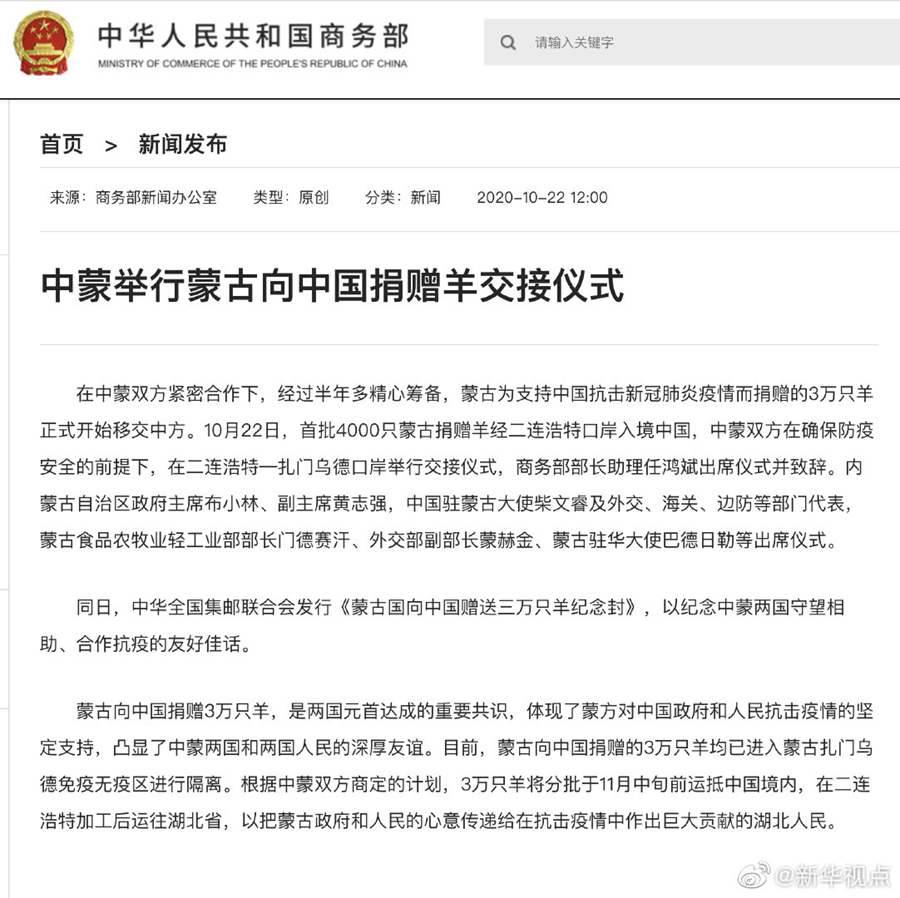 10月22日,首批4000只蒙古國捐贈羊經(jīng)二連浩特口岸入境中國,中蒙雙方在確保防疫安全的前提下,在二連浩特—扎門烏德口岸舉行交接儀式。詳情?? ????