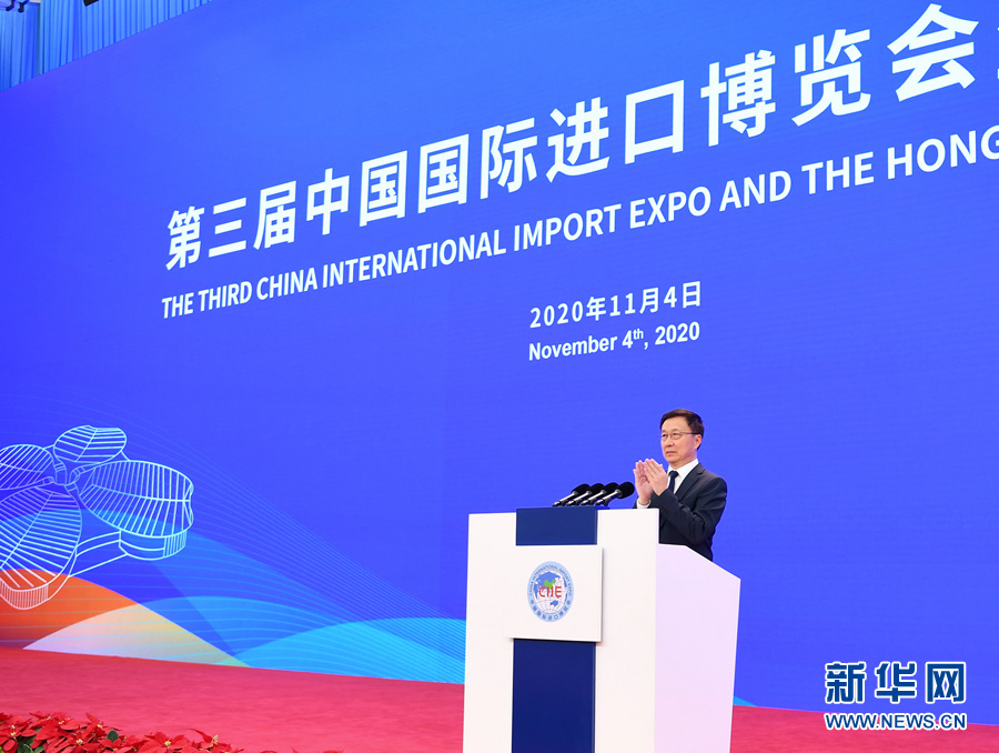 11月4日,中共中央政治局常委、國務(wù)院副總理韓正在上海出席第三屆中國國際進口博覽會開幕式。這是韓正宣布第三屆中國國際進口博覽會開幕。 新華社記者 燕雁 攝