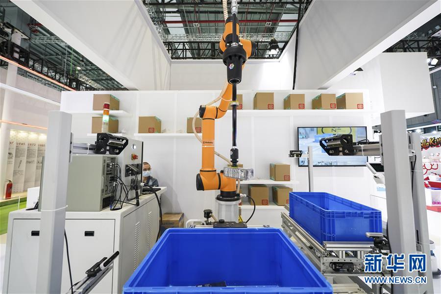 11月5日在第三屆進(jìn)博會服務(wù)貿(mào)易展區(qū)拍攝的物流分揀機(jī)器人。新華社記者 張豪夫 攝
