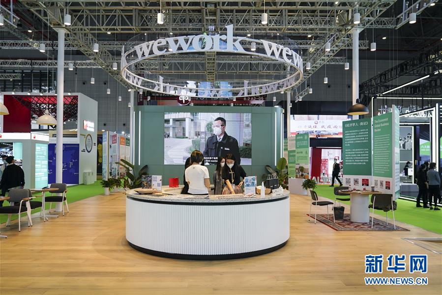 11月5日拍攝的第三屆進(jìn)博會服務(wù)貿(mào)易展區(qū)wework展臺。 新華社記者 張豪夫 攝