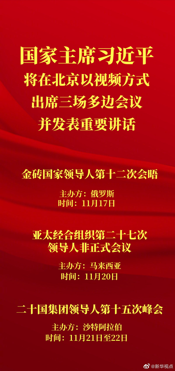 外交部發(fā)言人華春瑩12日宣布:應俄羅斯聯(lián)邦總統(tǒng)普京邀請,國家主席習近平將于11月17日出席金磚國家領導人第十二次會晤。應馬來西亞總理穆希丁邀請,國家主席習近平將于11月20日出席亞太經(jīng)合組織第二十七次領導人非正式會議。應沙特阿拉伯王國國王薩勒曼邀請,國家主席習近平將出席11月21日至22日舉行的二十國集團領導人第十五次峰會。上述會議將以視頻方式舉行,習近平主席將在北京出席有關活動并發(fā)表重要講話。