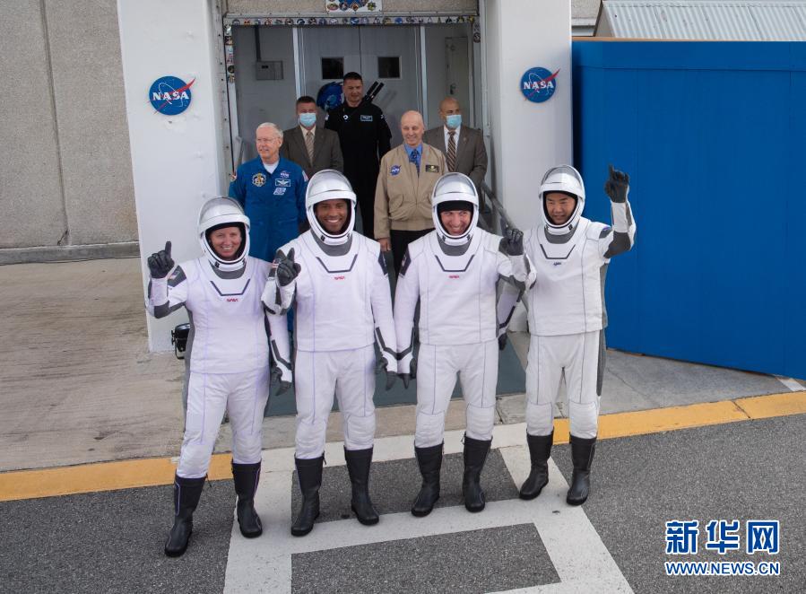 這是11月15日在美國佛羅里達州肯尼迪航天中心拍攝的參與這次代號“Crew-1”航天任務(wù)的宇航員香農(nóng)·沃克,維克托·格洛韋爾,邁克爾·霍普金斯,和日本宇宙航空研究開發(fā)機構(gòu)的宇航員野口聰一(從左至右)。 新華社發(fā)(美國航天局供圖)