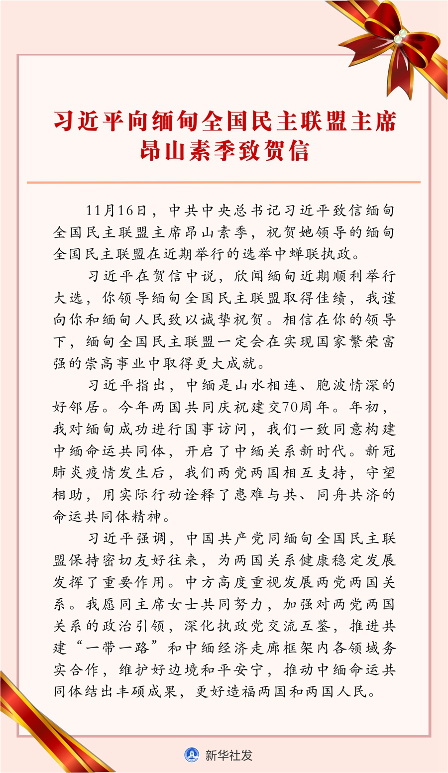 習近平在賀信中說,欣聞緬甸近期順利舉行大選,你領導緬甸全國民主聯(lián)盟取得佳績,我謹向你和緬甸人民致以誠摯祝賀。相信在你的領導下,緬甸全國民主聯(lián)盟一定會在實現(xiàn)國家繁榮富強的崇高事業(yè)中取得更大成就。