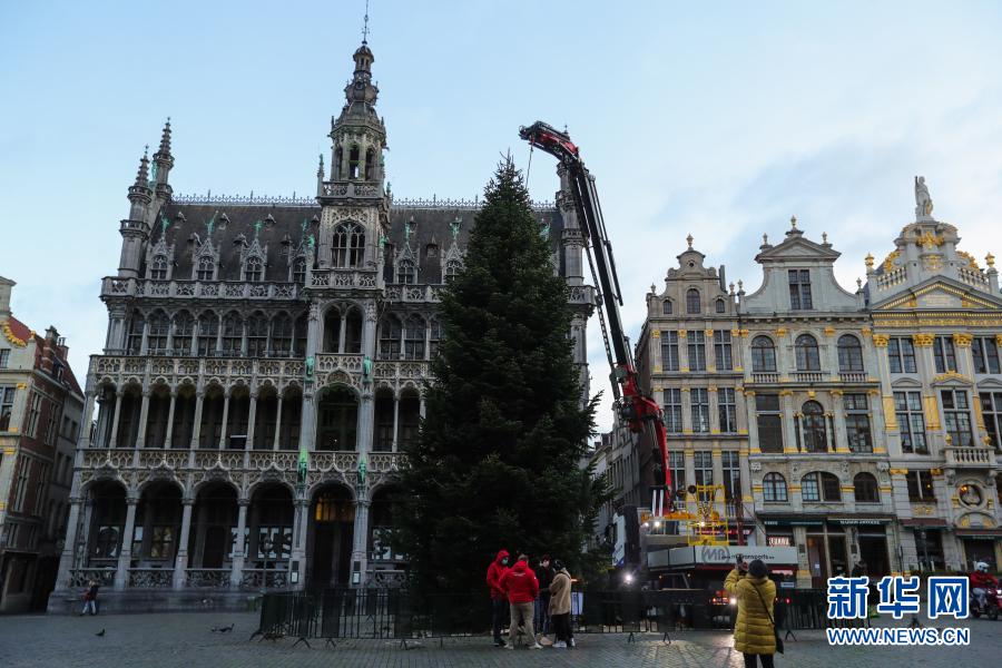 這是11月19日在比利時(shí)布魯塞爾大廣場(chǎng)拍攝的圣誕樹(shù)安裝現(xiàn)場(chǎng)。