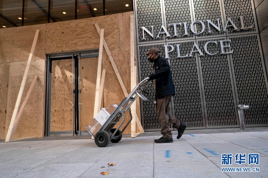 11月19日,美國(guó)華盛頓的一名快遞員經(jīng)過一處用木板加固門窗的辦公樓。新華社記者 劉杰 攝