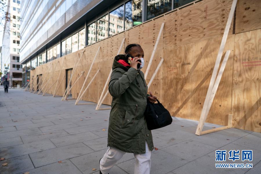 11月19日,在美國(guó)華盛頓,一名打電話的行人經(jīng)過用木板加固門窗的辦公樓。新華社記者 劉杰 攝