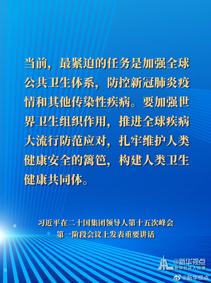 國家主席習(xí)近平21日晚在北京以視頻方式出席二十國集團(tuán)領(lǐng)導(dǎo)人第十五次峰會第一階段會議并發(fā)表重要講話。以下是講話要點(diǎn)。