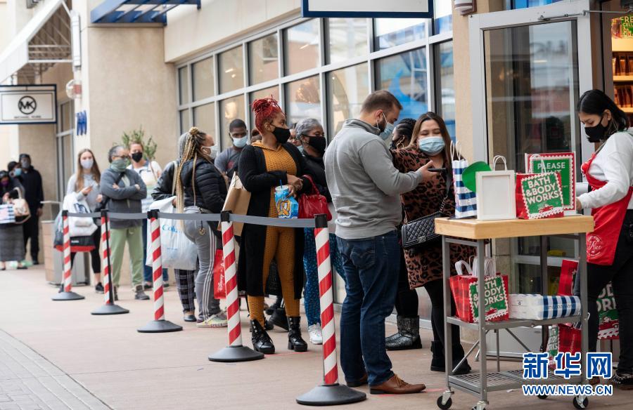 11月27日,人們?cè)诿绹?guó)馬里蘭州國(guó)家港灣一處購(gòu)物中心排隊(duì)等待進(jìn)店購(gòu)物。