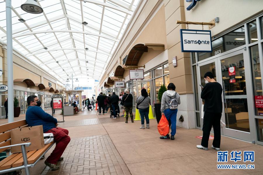 11月27日,人們在美國馬里蘭州國家港灣一處購物中心排隊(duì)等待進(jìn)店購物。