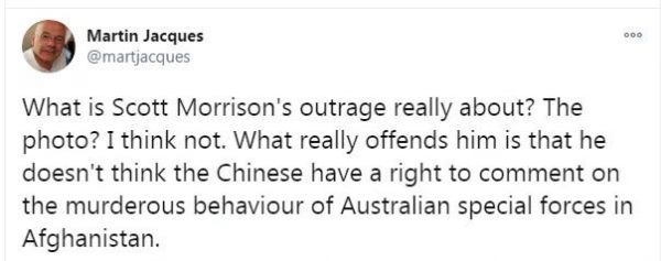 “莫里森的憤怒到底是什么?‘照片’?我想不是。真正令他惱怒的是,他認(rèn)為中國(guó)人無權(quán)對(duì)澳大利亞特種部隊(duì)在阿富汗的謀殺行為發(fā)表評(píng)論。”