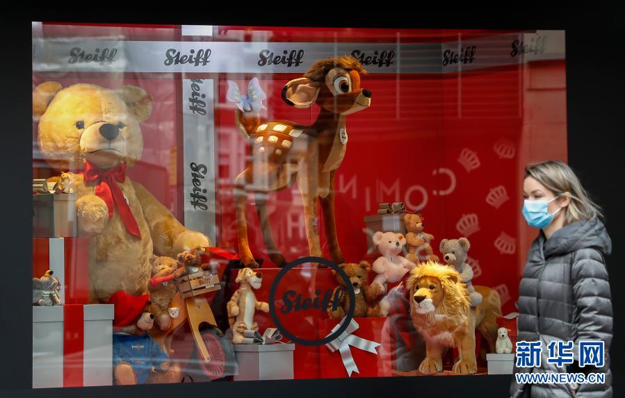 12月2日,一名戴口罩的女子從英國倫敦一家重新開門迎客的商店櫥窗前走過。