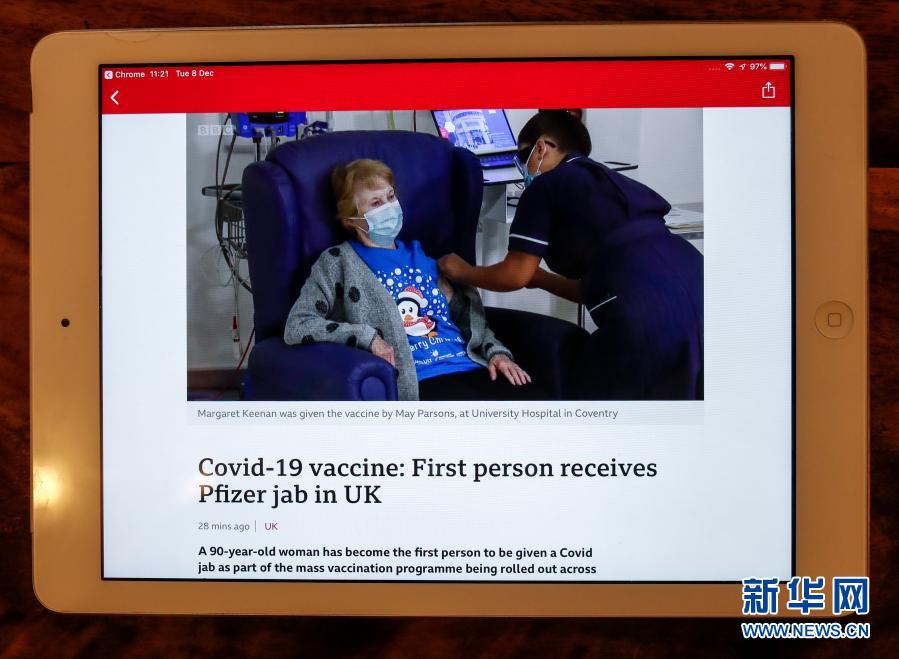 12月8日在英國倫敦拍攝的播放新聞的電腦屏幕顯示,醫(yī)護人員為90歲女子瑪格麗特·基南接種疫苗。瑪格麗特·基南是該國首位接種新冠疫苗的人。