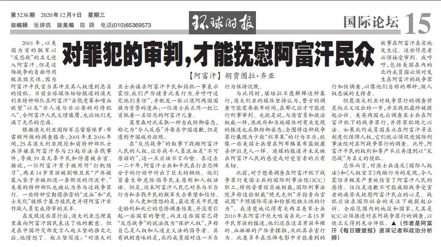 阿富汗《每日瞭望報(bào)》資深記者和政治分析師胡賈圖拉·齊亞在今日(12月9日)《環(huán)球時(shí)報(bào)》15版發(fā)表題為《對(duì)罪犯的審判,才能撫慰阿富汗民眾》的文章。以下是全文:
