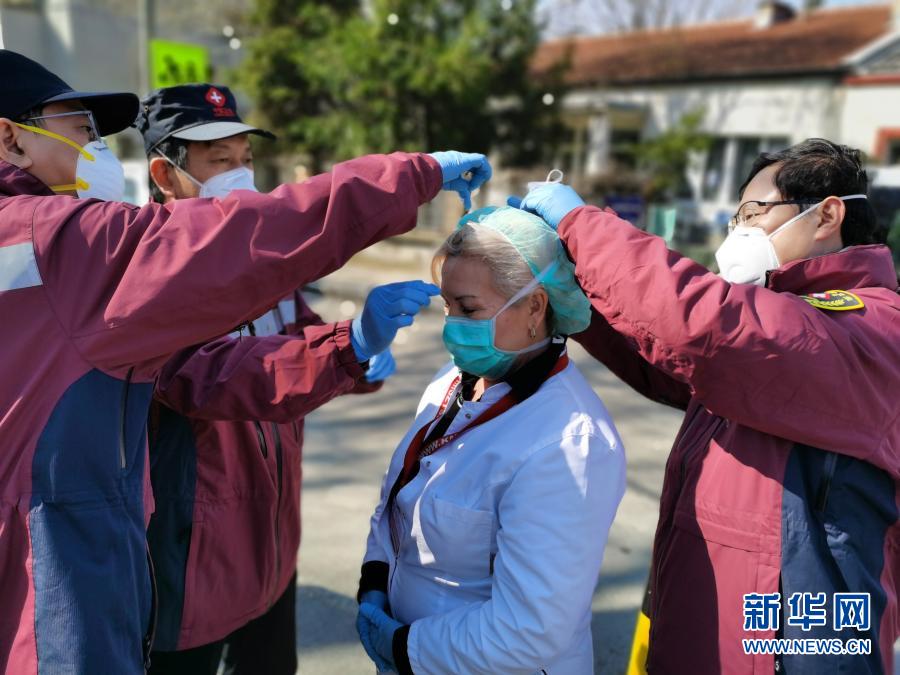 4月4日,中國(guó)赴塞爾維亞抗疫醫(yī)療專家組在貝爾格萊德的基層發(fā)熱門診走訪時(shí),幫助塞爾維亞醫(yī)生特里富諾維奇(中)佩戴高標(biāo)準(zhǔn)的防護(hù)口罩。新華社發(fā)