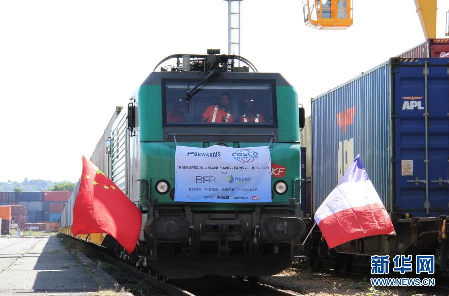 6月23日,滿載防疫物資的中歐班列抵達(dá)法國(guó)巴黎東南郊的瓦朗通,此次班列是中法首趟抗疫物資專列。新華社記者 徐永春 攝?