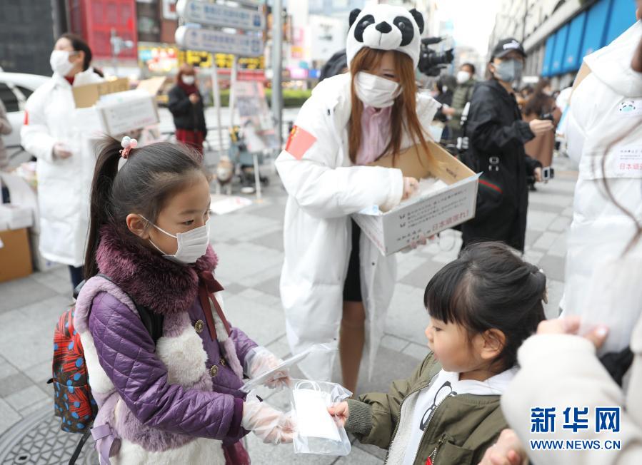 2月29日,在日本東京的池袋站前,在日華僑華人志愿者團(tuán)體“口罩熊貓行動(dòng)小組”向當(dāng)?shù)孛癖娒赓M(fèi)發(fā)放口罩,一名小志愿者(左)將兒童用口罩送給日本小朋友。新華社記者 杜瀟逸 攝