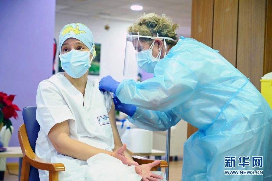 12月27日,護工莫妮卡·塔皮亞斯(左)在西班牙瓜達拉哈拉的洛斯奧爾莫斯養(yǎng)老院內(nèi)接受新冠疫苗注射。