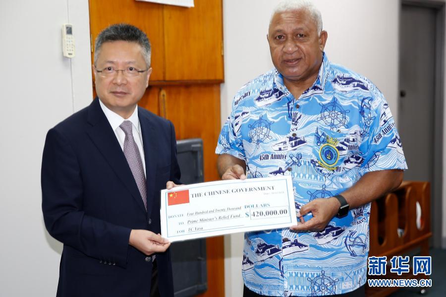 當(dāng)天在斐濟(jì)總理辦公室舉行的儀式上,中國駐斐濟(jì)大使錢波代表中國政府向斐濟(jì)總理姆拜尼馬拉馬轉(zhuǎn)交了這筆援助款。