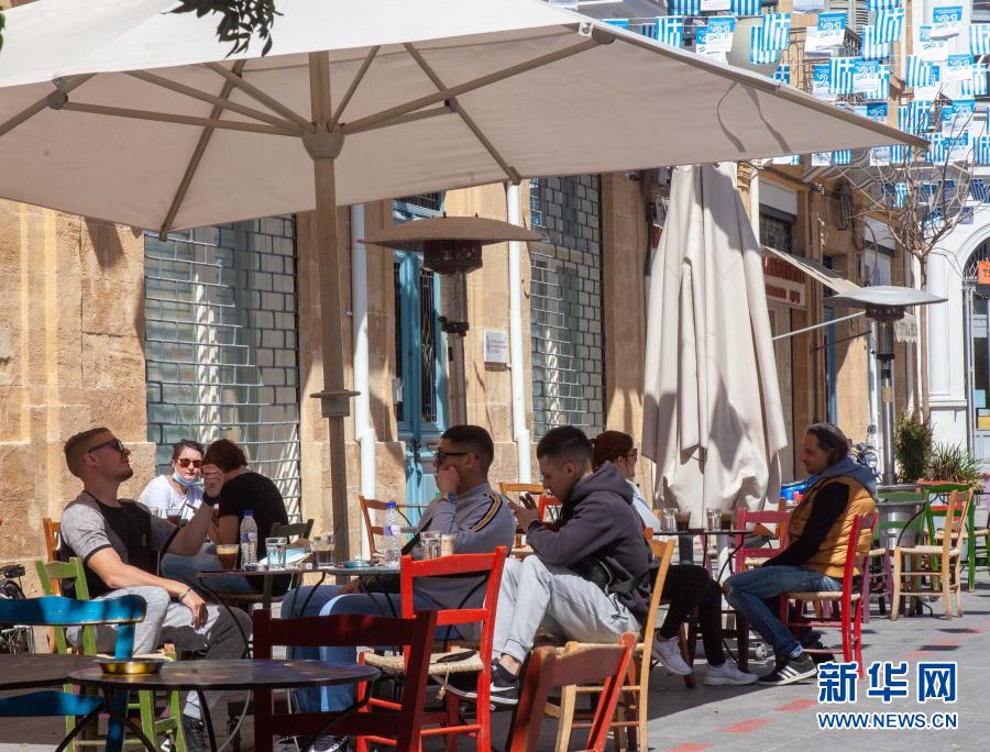 3月16日,人們坐在塞浦路斯首都尼科西亞一家咖啡館的室外區(qū)域。