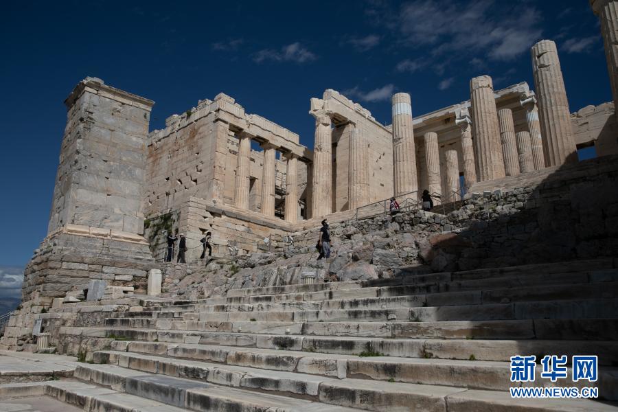 3月22日,游客游覽希臘雅典衛(wèi)城。希臘露天考古遺跡22日起恢復(fù)開放。游客需遵守保持社交距離和佩戴口罩等防疫規(guī)定。新華社發(fā)(萊夫特里斯·帕察里斯攝)