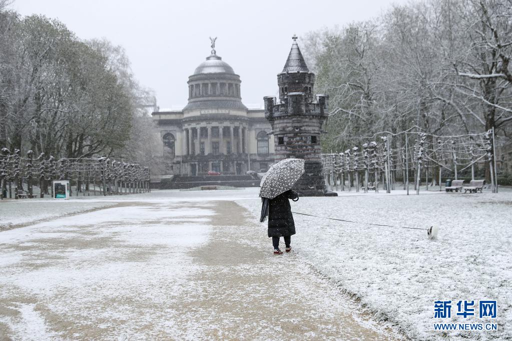 4月6日,一名市民在比利時布魯塞爾五十周年紀(jì)念公園冒雪遛狗。