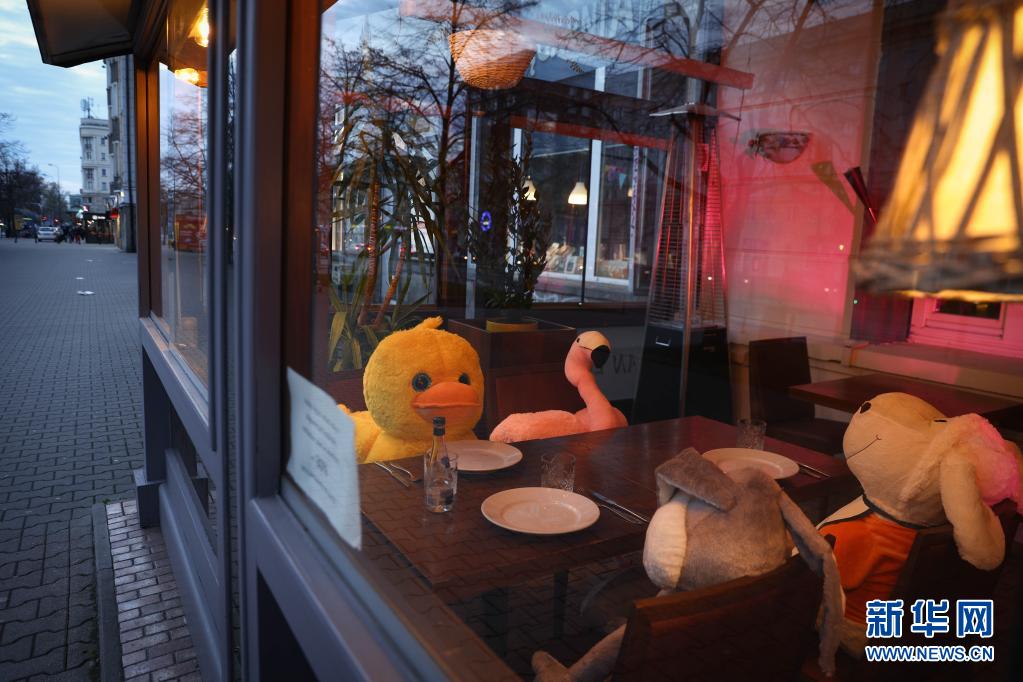 4月13日,波蘭首都華沙一家餐館將動(dòng)物玩偶擺放在靠窗座位上吸引顧客。