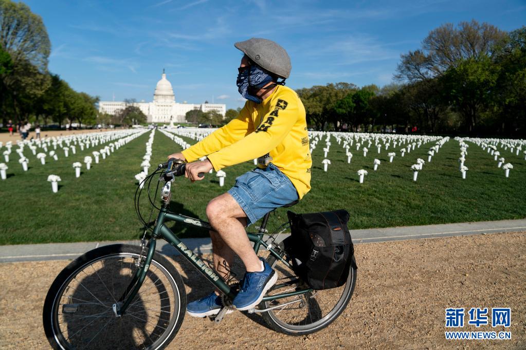 4月13日,一名男子騎車經(jīng)過美國華盛頓國家廣場草坪上擺放的白色絹花。