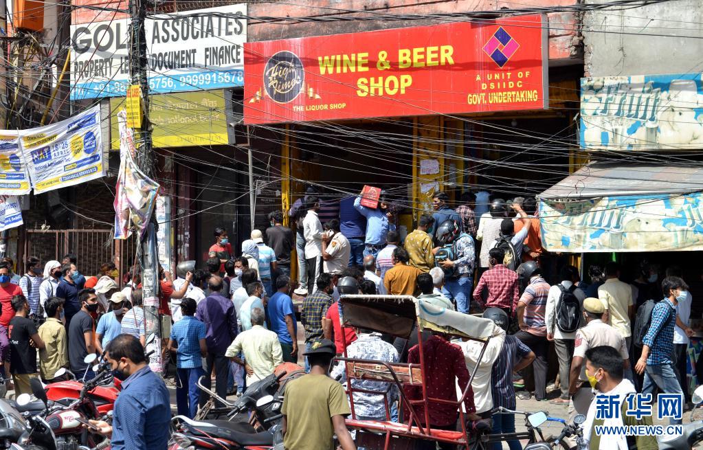 4月19日,印度新德里居民在全城實施封鎖前搶購酒品。