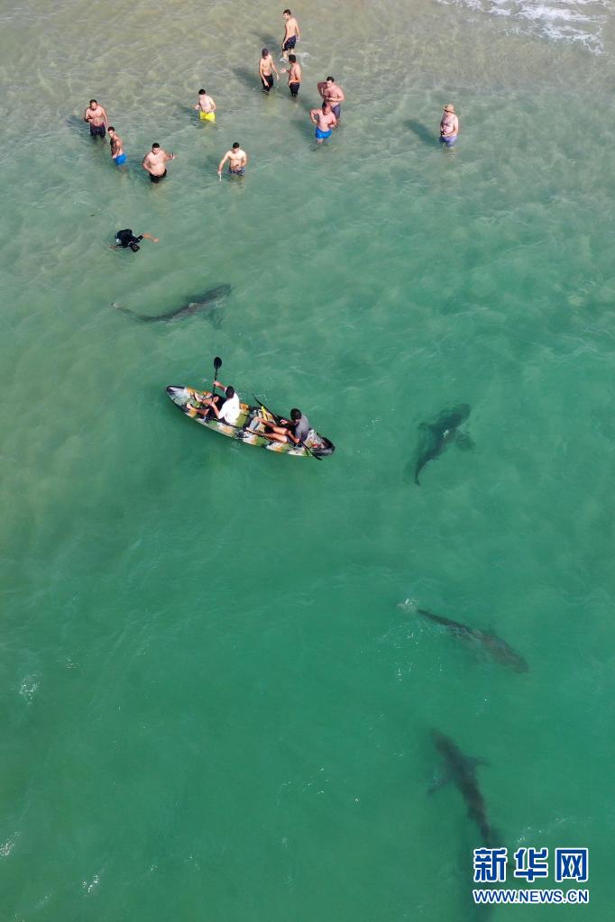 4月20日,在以色列北部城市哈代拉的海邊,鯊魚(yú)從人們身邊游過(guò)(無(wú)人機(jī)照片)。