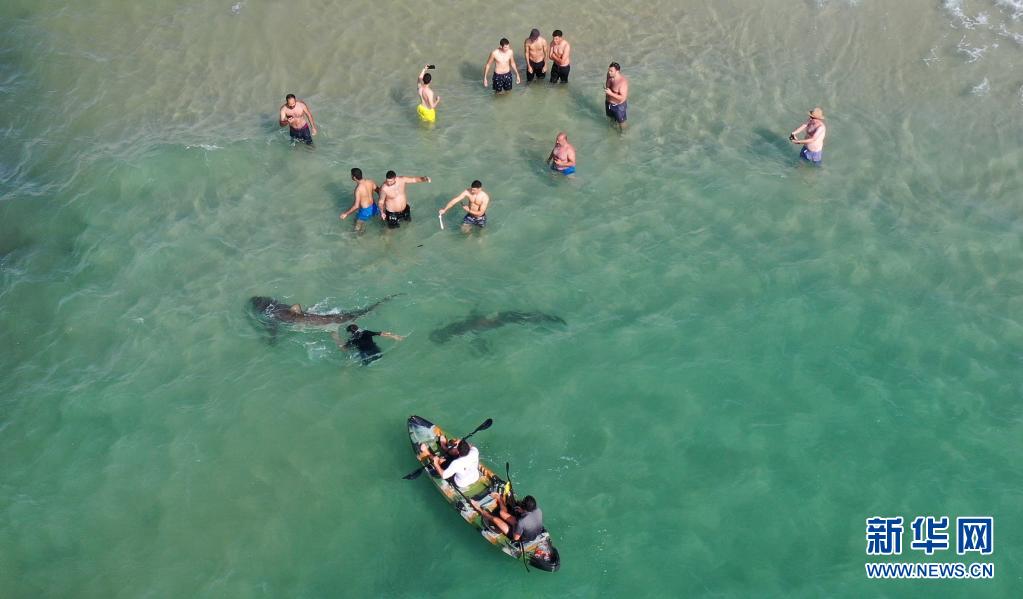 4月20日,在以色列北部城市哈代拉的海邊,鯊魚(yú)從人們身邊游過(guò)(無(wú)人機(jī)照片)。