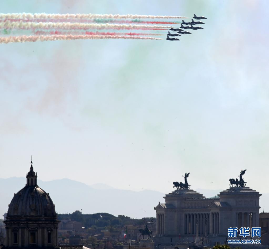 4月25日,意大利“三色箭”飛行表演隊在羅馬舉行的紀念儀式上噴出代表意大利國旗顏色的紅白綠三色煙霧。