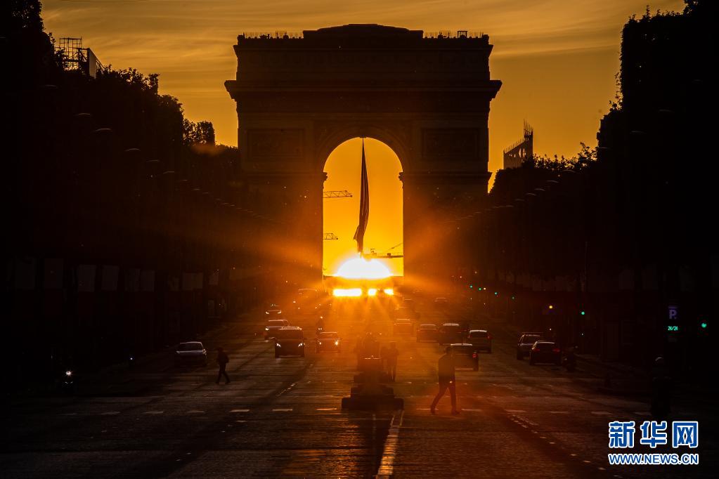 這是5月8日在法國(guó)巴黎香榭麗舍大街拍攝的凱旋門落日景象。