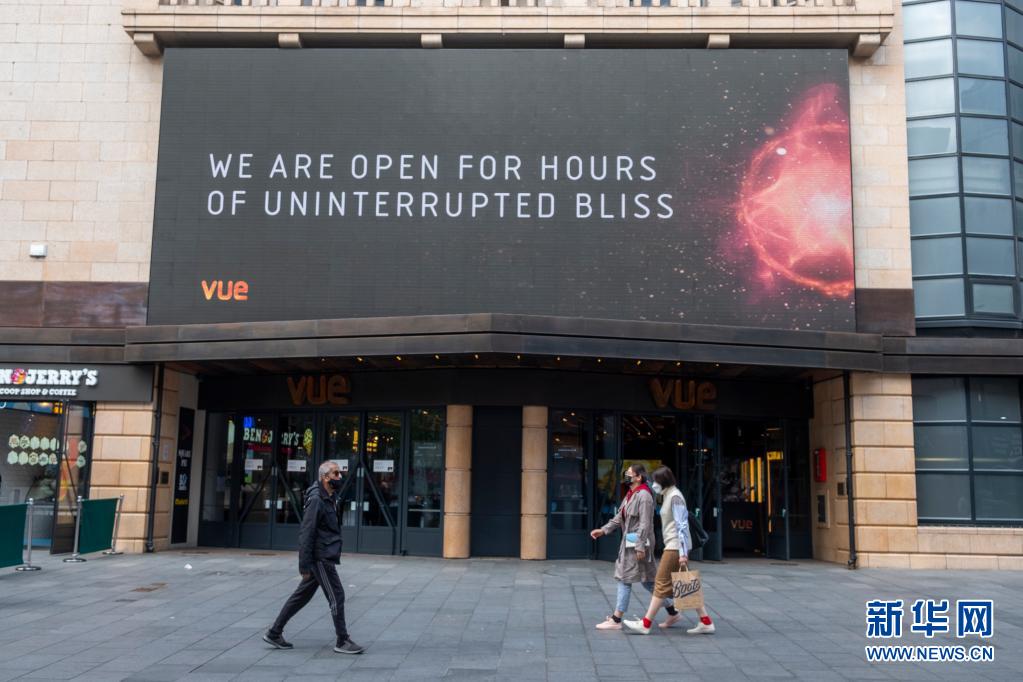 5月17日,人們從英國(guó)倫敦一家重開的電影院門前走過(guò)。