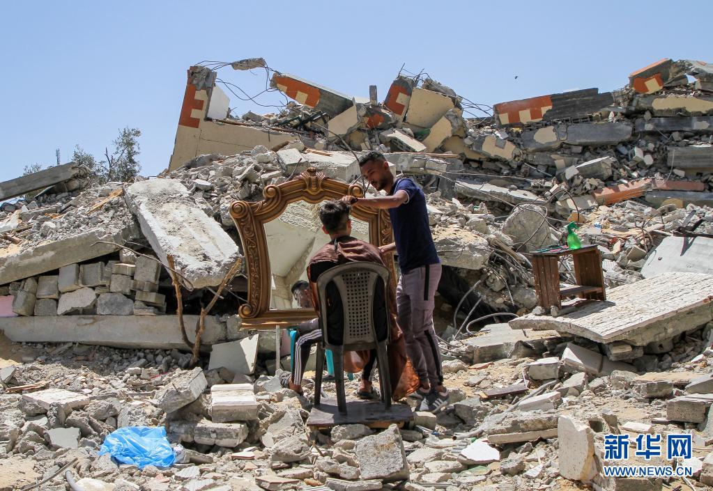 5月26日,在加沙地帶北部的城鎮(zhèn)貝特拉希亞,23歲的巴勒斯坦理發(fā)師阿卜杜拉·扎瓦拉在他被以色列炸毀的房屋前為顧客免費服務?!⌒氯A社發(fā)(里澤克·阿卜杜勒·賈瓦德攝)