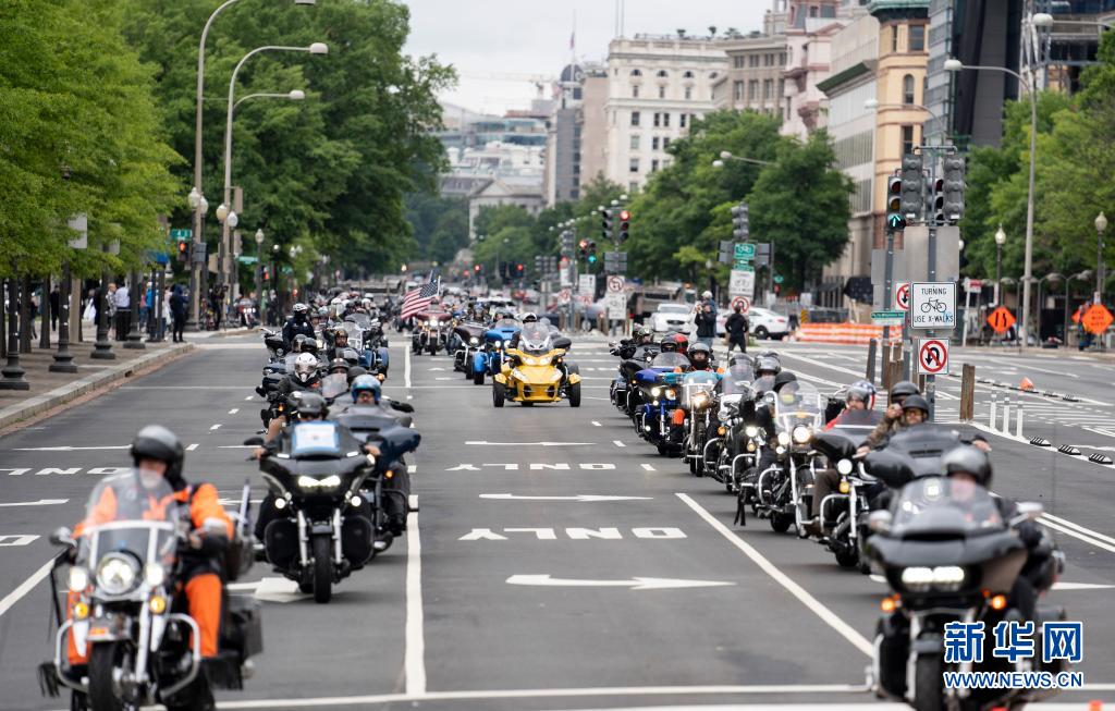 5月30日,在美國(guó)首都華盛頓,參加“滾雷”摩托車大游行的車輛駛過街頭。