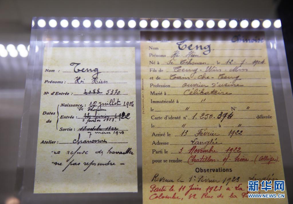 這是2021年3月22日在中國旅法勤工儉學蒙達爾紀紀念館拍攝的鄧小平當年在法國的居留登記卡和工作檔案卡。新華社記者 高靜 攝