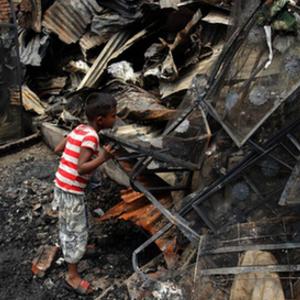 6月7日,一名兒童在孟加拉國首都達(dá)卡發(fā)生火災(zāi)的貧民窟廢墟中尋找個(gè)人物品。