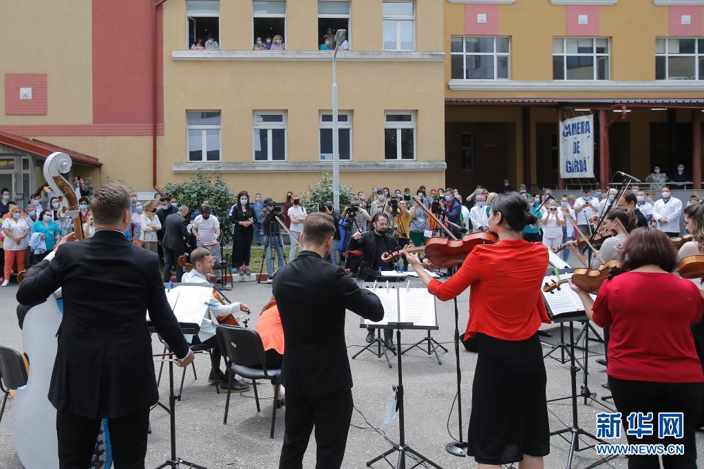 當日,羅馬尼亞首都布加勒斯特一個樂隊在該國一家傳染病醫(yī)院——馬太·巴爾什醫(yī)院演出,向抗擊新冠疫情的醫(yī)務工作者致謝。