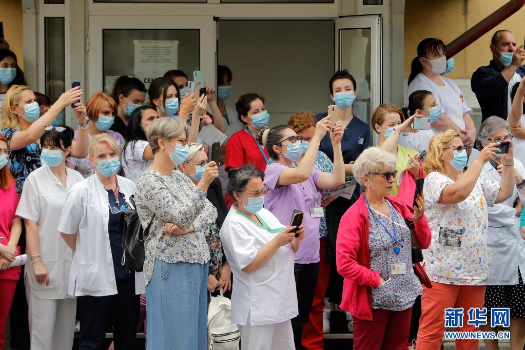 當(dāng)日,羅馬尼亞首都布加勒斯特一個樂隊在該國一家傳染病醫(yī)院——馬太·巴爾什醫(yī)院演出,向抗擊新冠疫情的醫(yī)務(wù)工作者致謝。